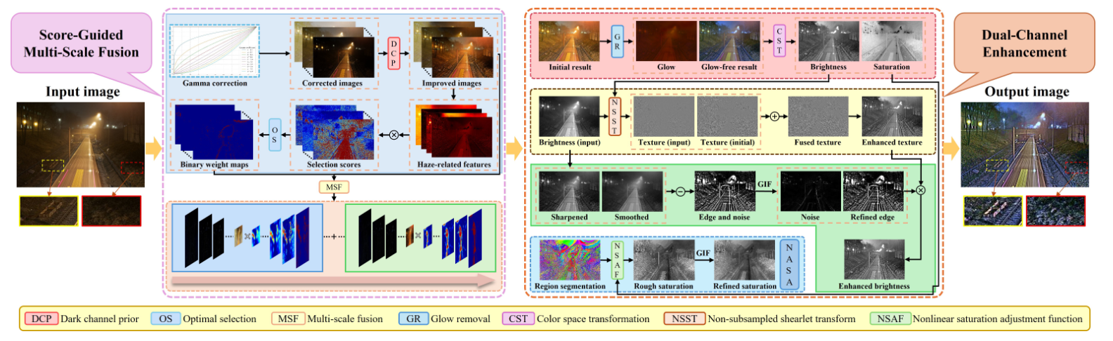 - T. Li, Yun Liu*, S. Luo, W, Ren, W. Lin. Real-World Nighttime Dehazing via Score-Guided Multi-Scale Fusion and Dual-Channel Enhancement. IEEE Transactions on Circuits and Systems for Video Technology (T-CSVT). 2025. (CCF-B, Corresponding author)