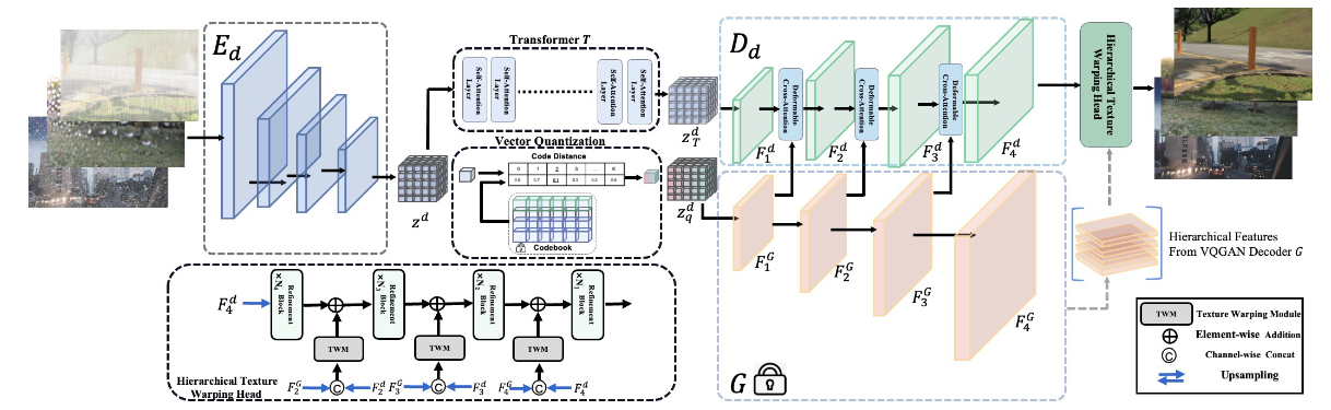 - T. Ye, S. Chen, J. Bai, J. Shi, C. Xue, J. Jiang, J. Yin, E. Chen, Yun Liu*. Adverse Weather Removal with Codebook Priors. Proceedings of the IEEE/CVF international conference on computer vision (ICCV). 2023: 12653-12664. (CCF-A, Corresponding author)